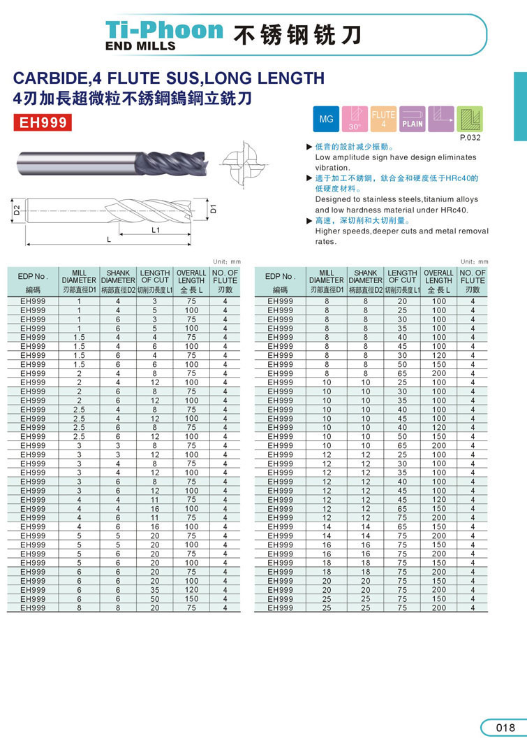 2. 4刃加長不銹鋼立銑刀018