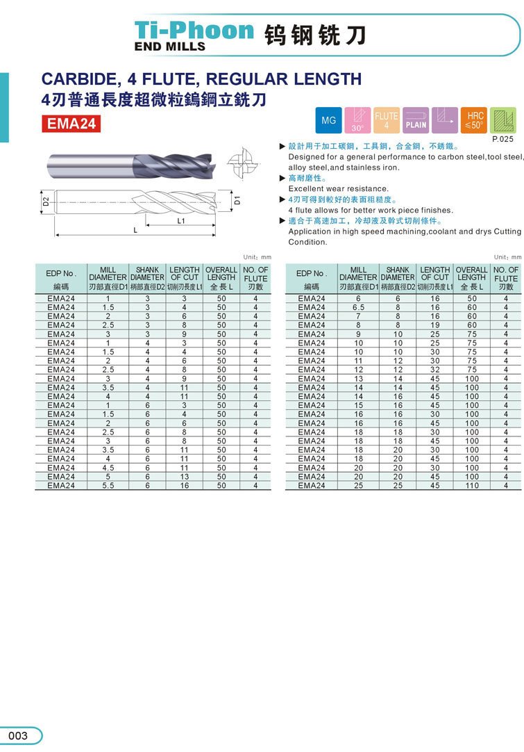 16. 4刃超微粒鎢鋼斜度立銑刀024
